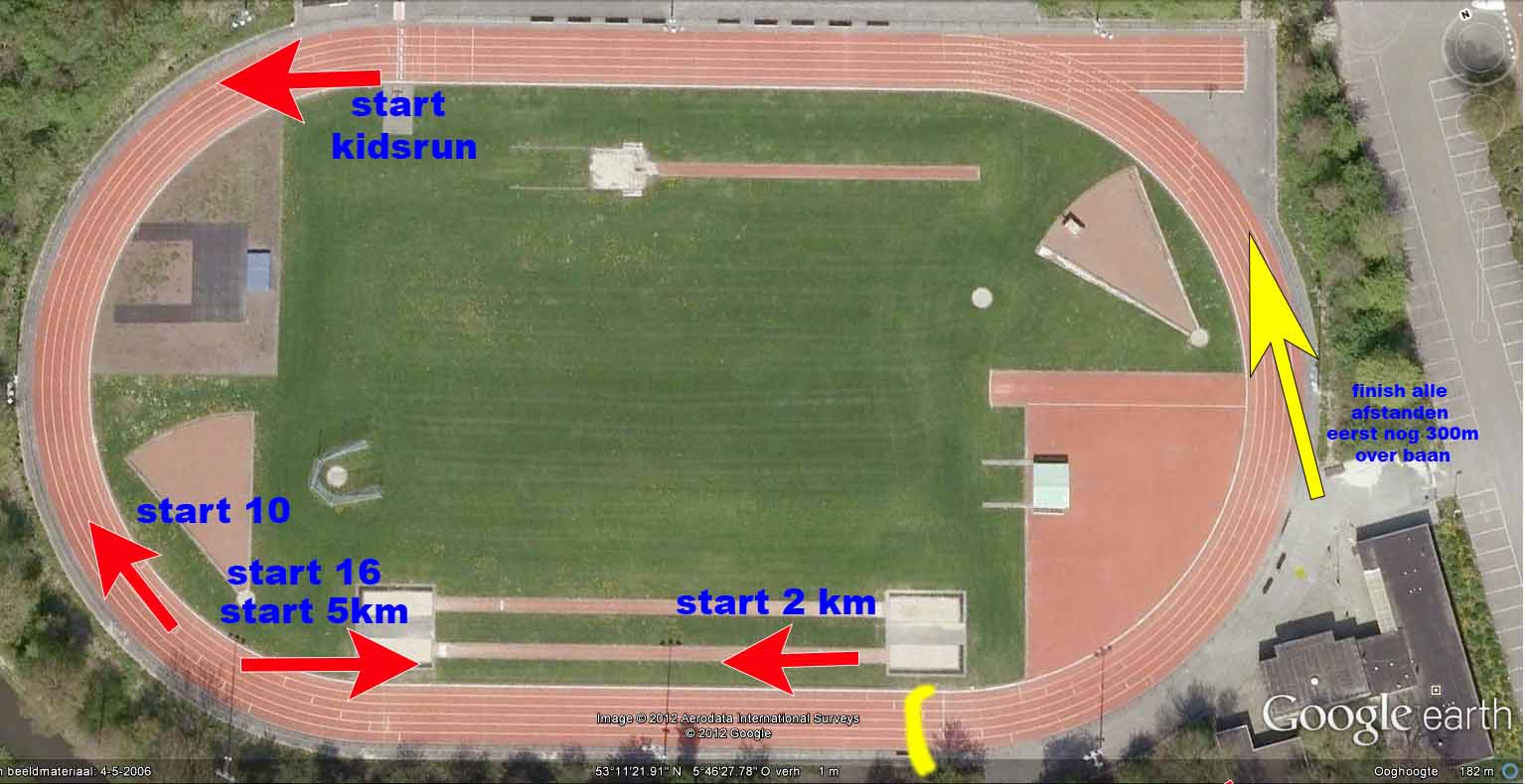 1 km : 2,5 rondes op de baan, start bij de finish-trap