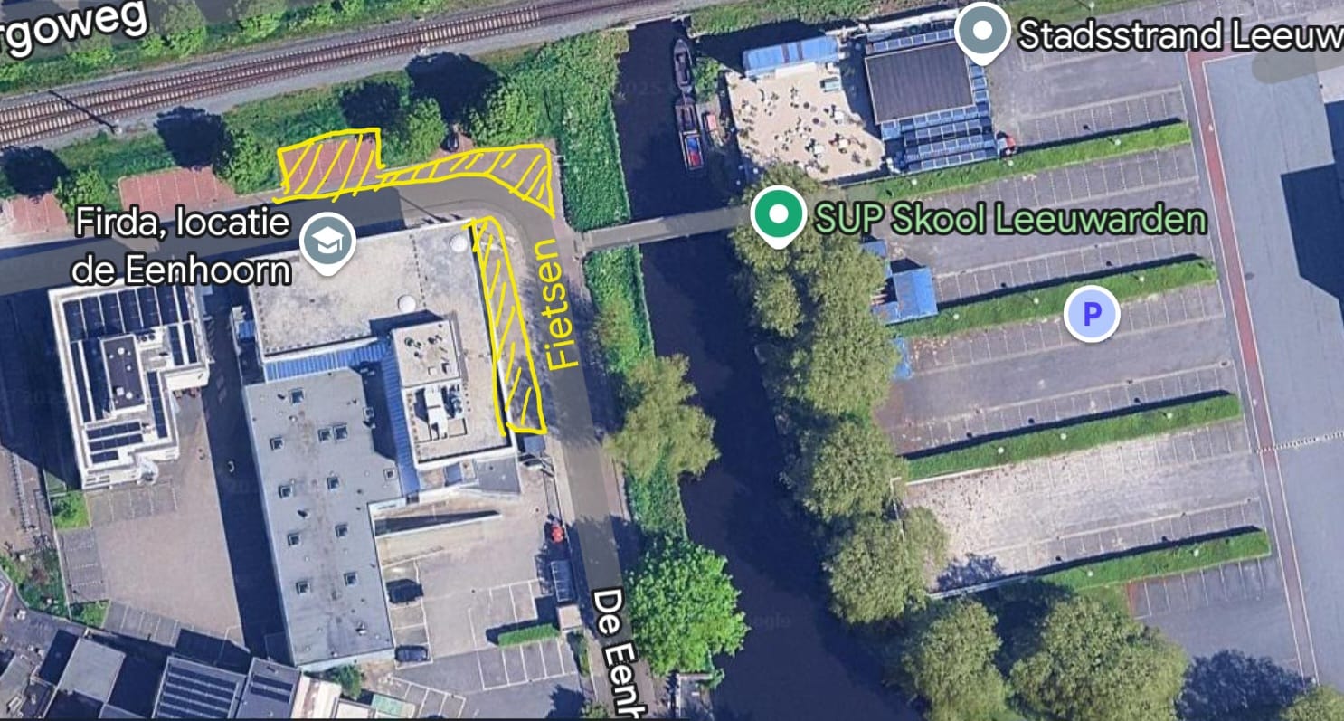 Fietsen kunnen bij Firda worden geplaatste aan de Eenhoorn, het Stadsstrand kan dan via de brug worden bereikt (zie onderstaande foto)